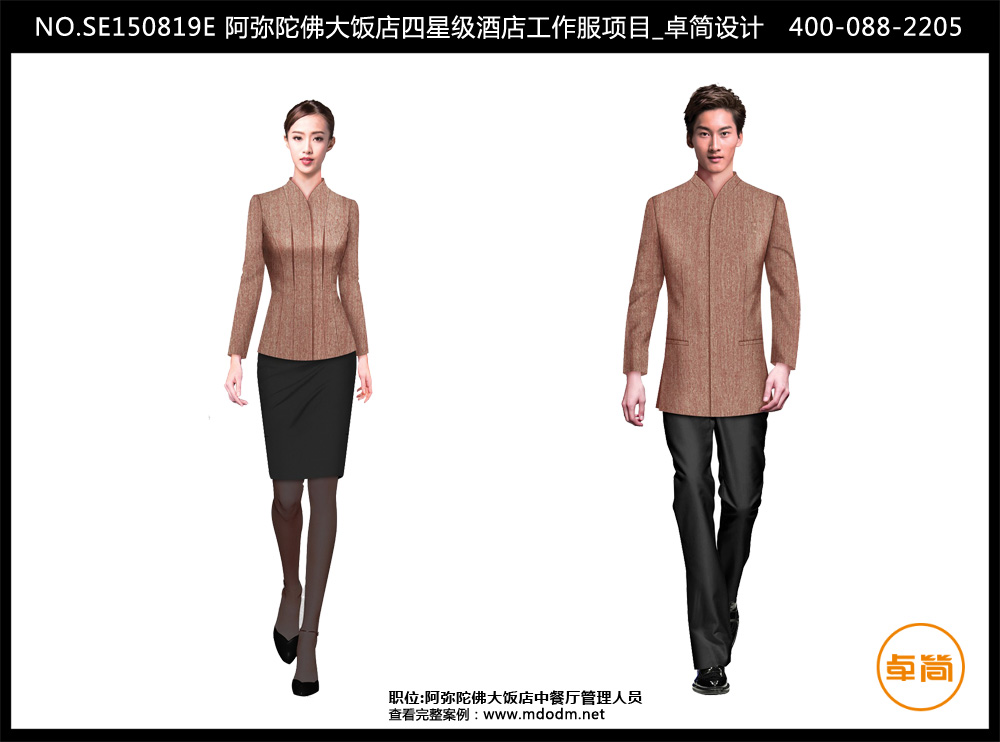 本次设计主要抓住中式汉唐服饰的特点元素与酒店的场景装饰和氛围的特点元素相结合,服饰面料时尚舒适,款式沉稳干练与酒店整体环境相融合;各不同岗位的款式设计上我们设计团队在保持统一性的同时也能捕捉到服装的赋予的职业代表性。本着简洁大方的设计思路打造不一样的视觉感,舒适且美观。